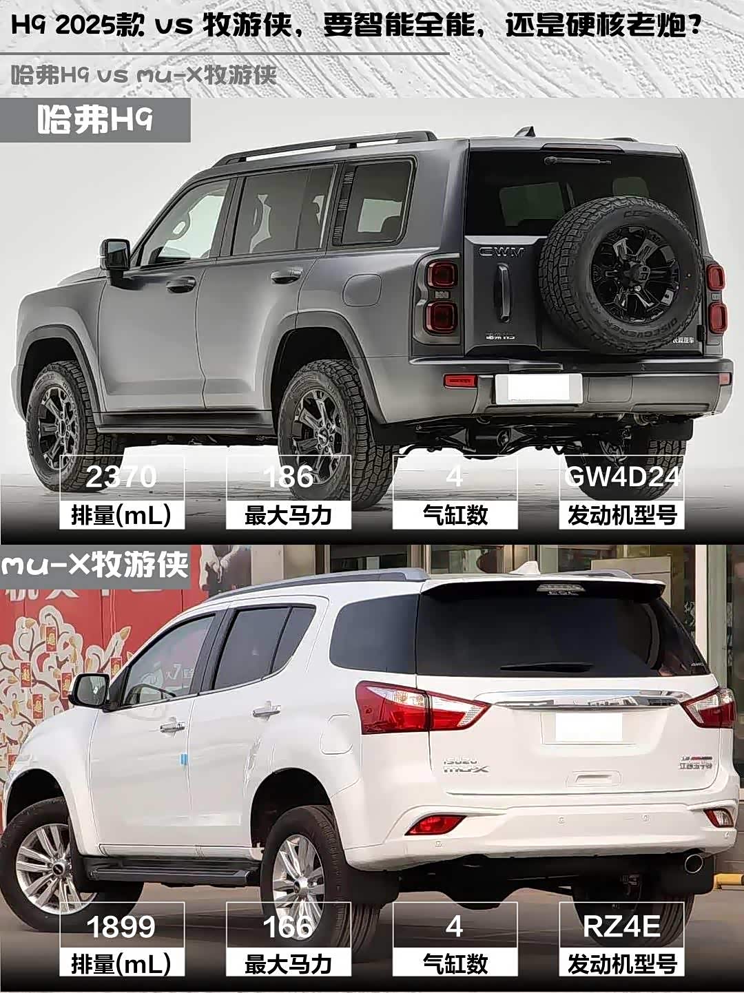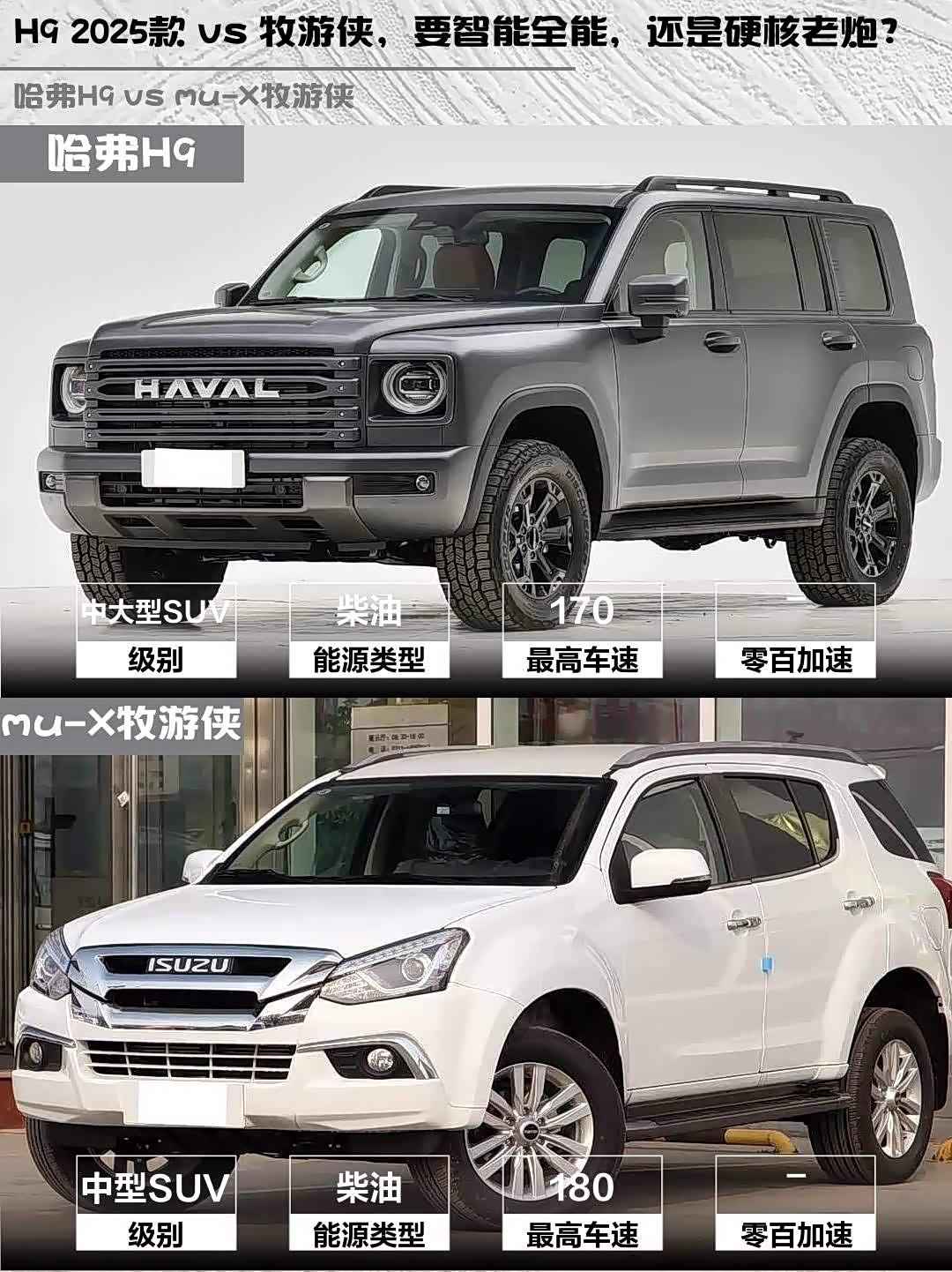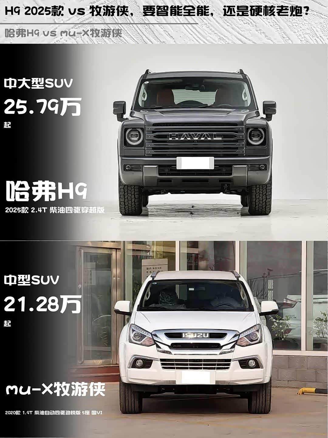 最近后台好多兄弟在问硬派柴油SUV怎么选,尤其是哈弗H9 2025款 2.4T柴油四驱穿越版和 mu-X牧游侠(参数|询价)2020款1.9T柴油自动四驱劲悦版这两款🔥 作为开过两台车的老司机,今天直接上干货对比!