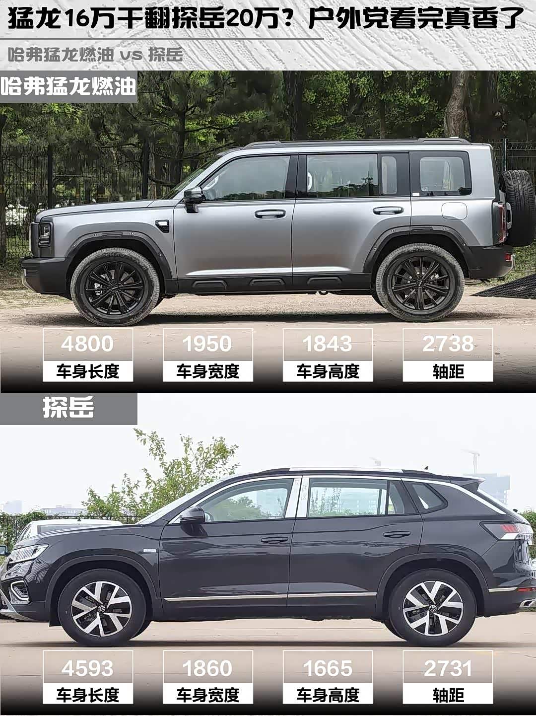 猛龙255mm宽胎+200mm离地间隙,原厂就带拖车钩接口,周末拖个房车/摩托艇说走就走。探岳更适合城市通勤,6.7L/100km油耗确实香,但235mm轮胎跑非铺装路面要小心。