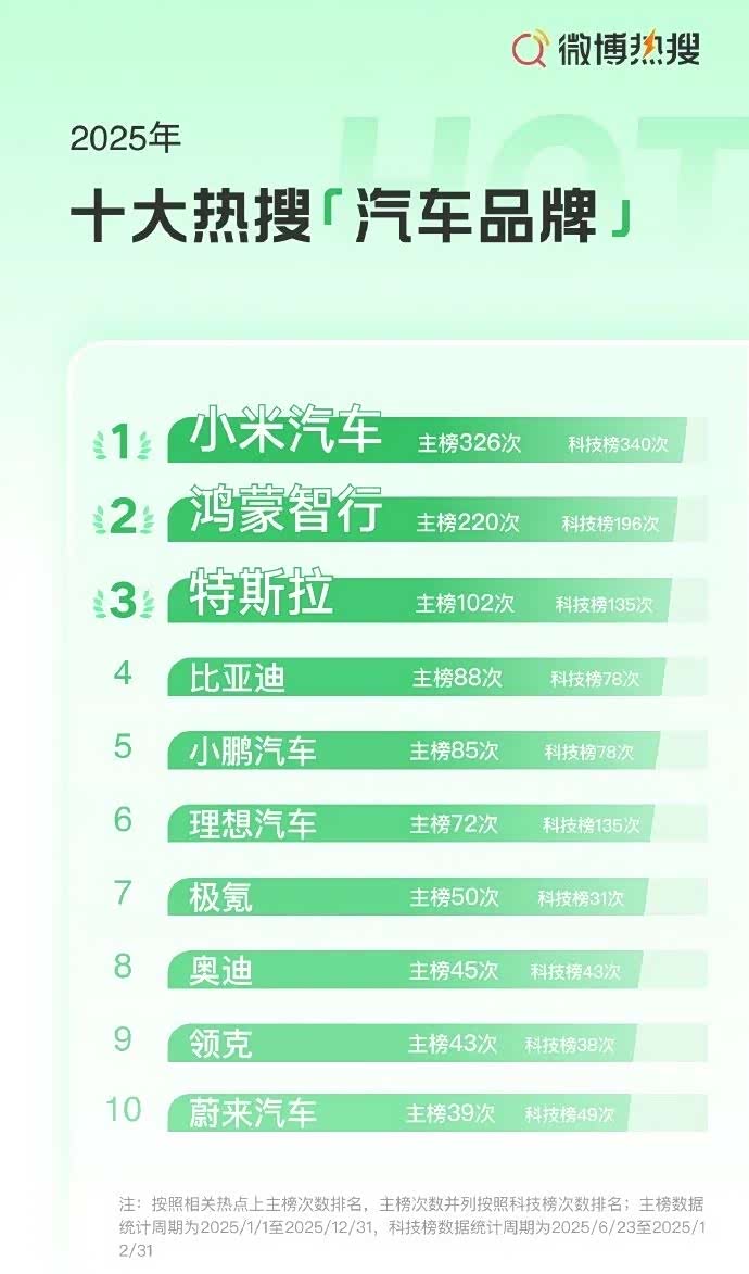 微博热搜发布《2025年汽车行业热搜趋势报告》,公布了“十大热搜汽车品牌”和“十大热搜汽车事件”。2025年,汽车行业热点上榜2,874个,热搜主榜TOP10数量202个,比亚迪、华为、小米、特斯拉、理想、极氪等汽车品牌,以及雷军、余承东、魏建军等相关高管成为热搜关键词。十大热搜汽车品牌”榜单中,以小米汽车、鸿蒙智行为代表的科技属性品牌占据舆论高地,而传统豪华阵营BBA中仅奥迪跻身前十。