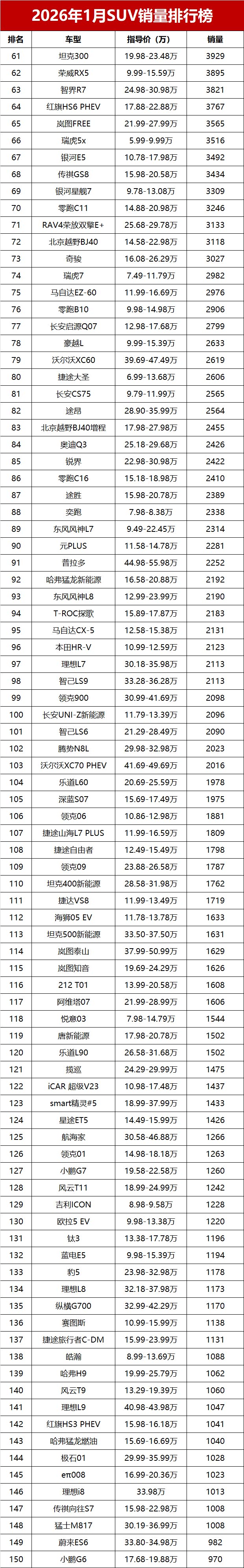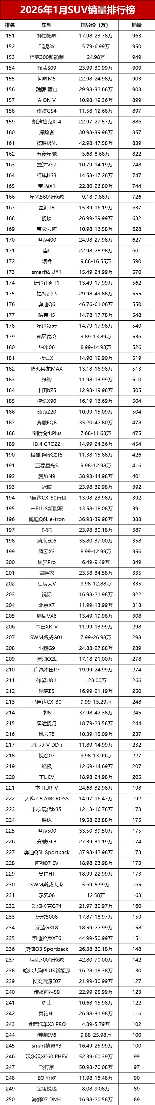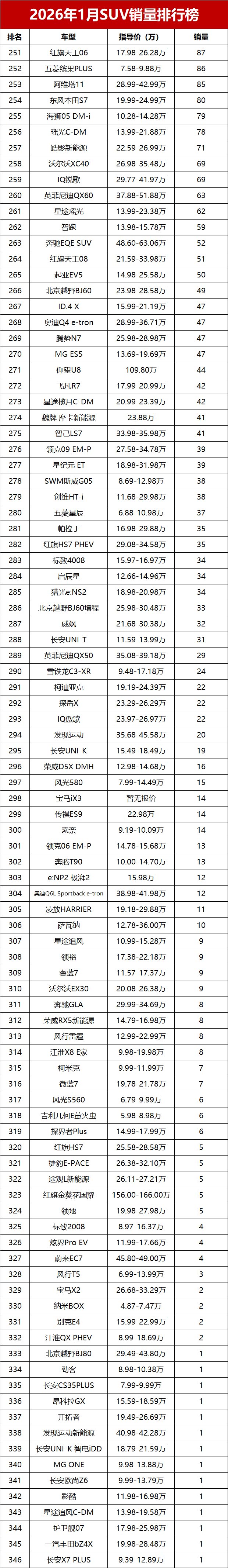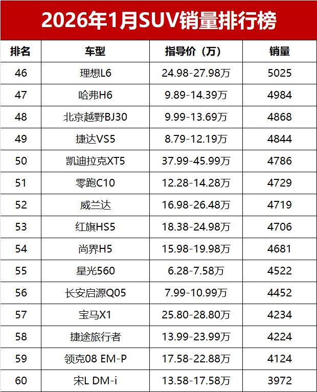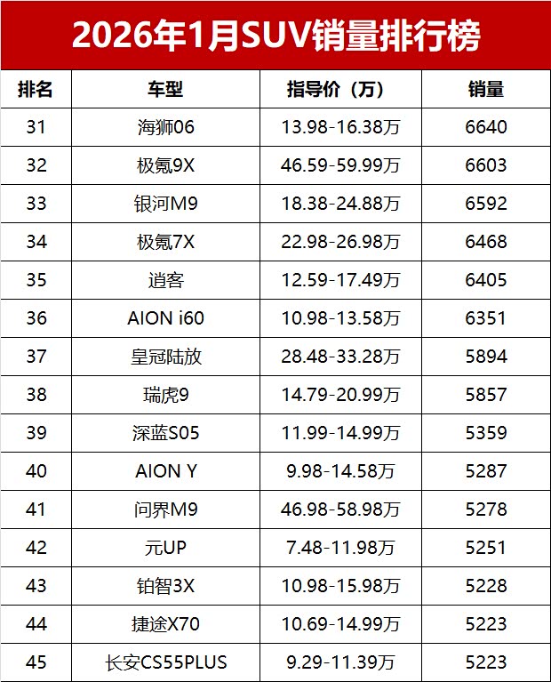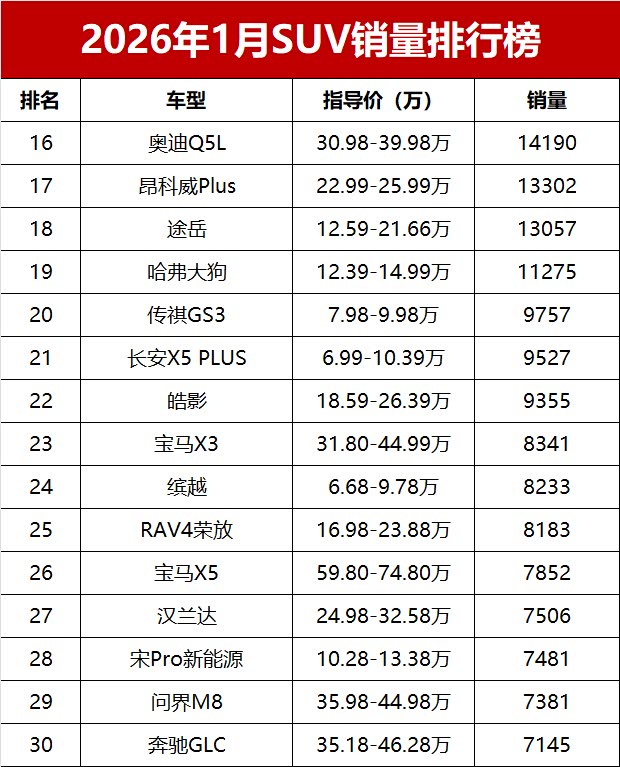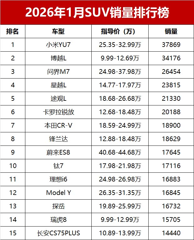【2026年1月我国SUV车型零售销量排行榜 完整版】新年首月,国内SUV市场未能迎来“开门红”,乘联会数据显示,2026年1月国内SUV市场零售销量仅84.3万辆,同比小幅减少5.2%。新能源SUV表现强势,前三位中占据两席;10-20万主流价位车型依旧是市场中坚力量,多款燃油SUV展现出不俗韧性;豪华SUV阵营分化明显,部分高端车型销量稳步提升,而曾经的“国民SUV”哈弗H6则销量低迷,未能跻身前三十。又一份销量成绩单出炉!变天了!1月SUV零售销量榜,仅17款车破万辆, 小米YU7(参数|询价)登顶!