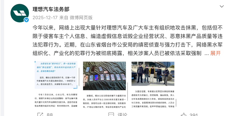 正如理想汽车曾披露的,这类负面舆情多带有同质化、规模化特征,涉嫌有组织的违法犯罪,并非理想车主群体的真实写照。