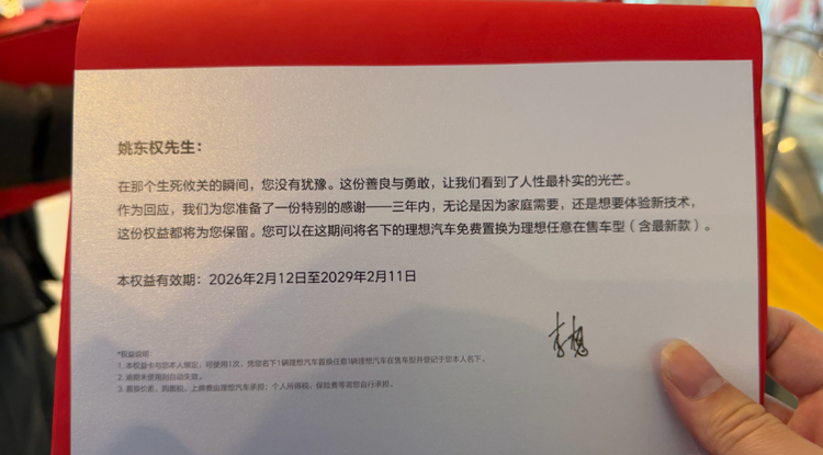 李想的举动,看似是个人层面的感谢,实则是理想汽车“用户企业”定位的最好践行:当用户用你的产品传递善意、守护生命时,车企也该挺身而出,给予最坚实的回应。
