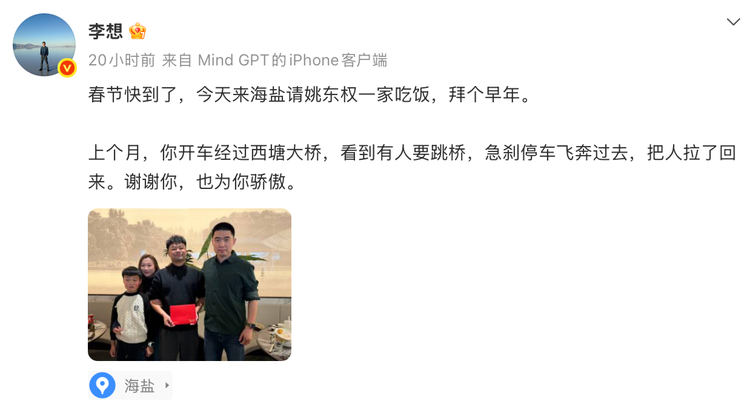 2月12日,临近春节,他专程从北京赶赴海盐,和姚东权一家围坐在一起吃了一顿家常饭。而除了这顿跨越千里的饭局,李想还带来了一份惊喜——一张定制专属权益卡。