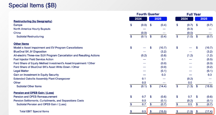 全年82亿美元亏损的背后,是福特为过去的“激进布局”买单,去年年底,福特宣布将计提约195亿美元的特殊项目费用,在财报中也披露了和电车业务相关的费用高达174亿美元,用于取消部分大型电动车生产计划、全球业务重组及相关资产减值,而且大部分计入了2025年第4季度。