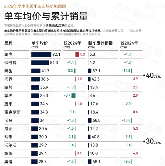 最近,杰兰路咨询公司发布了一份2025年度中国乘用车市场价格回顾,其中几乎所有的豪华品牌的平均售价都在下跌,但捷豹路虎旗下的路虎品牌,却以92.1万元的单车均价,和8.2万元的、全行业同期最高的涨幅,位居所有年销量超过2万辆的高端豪华汽车品牌榜首。