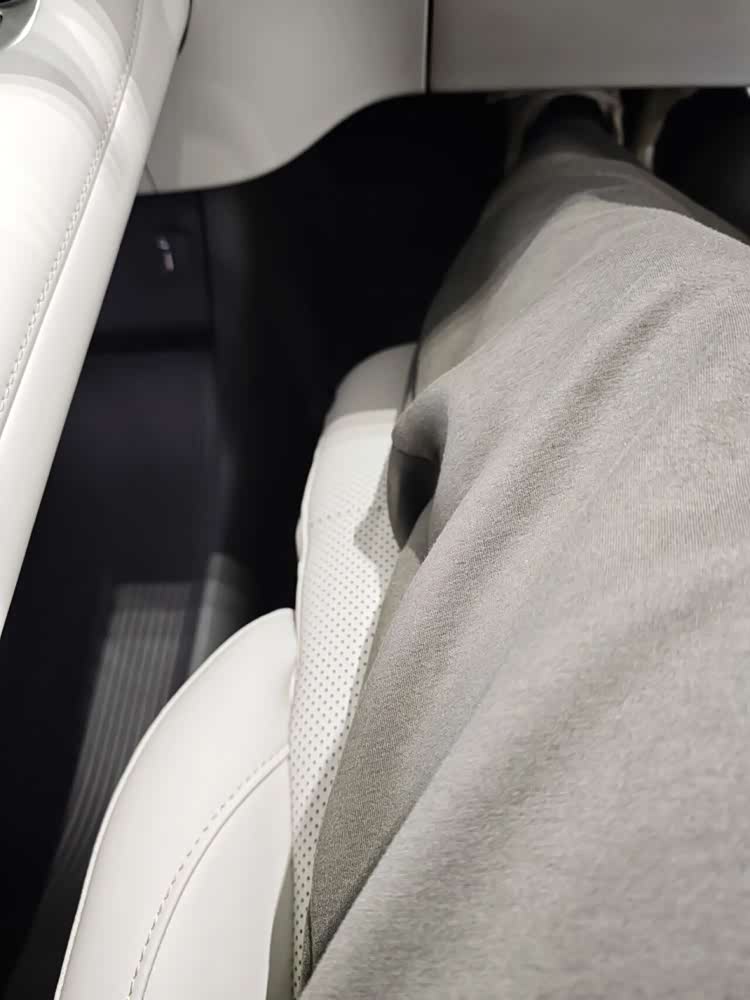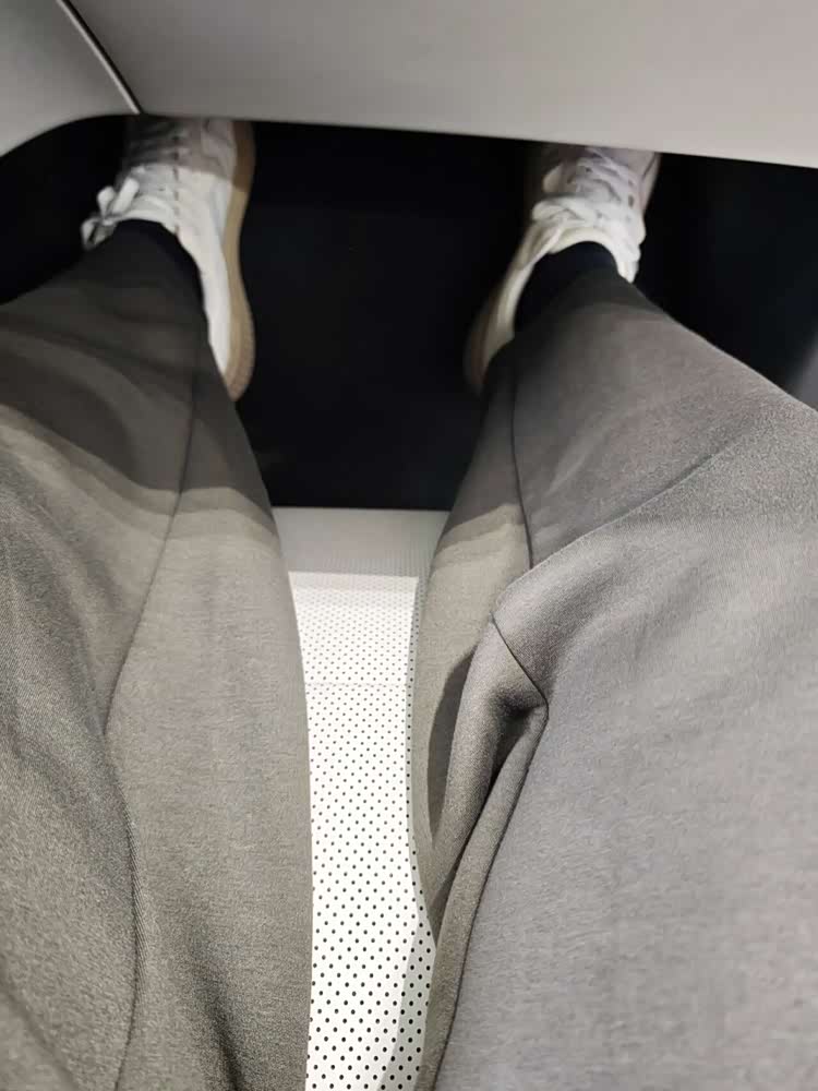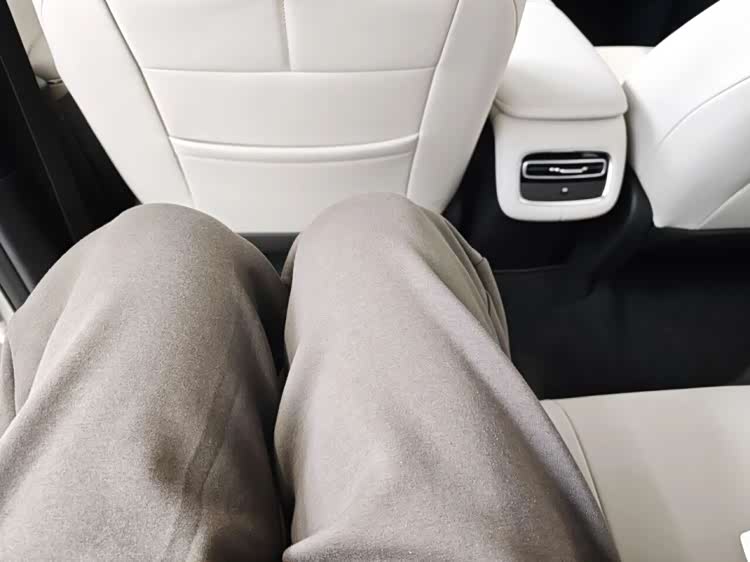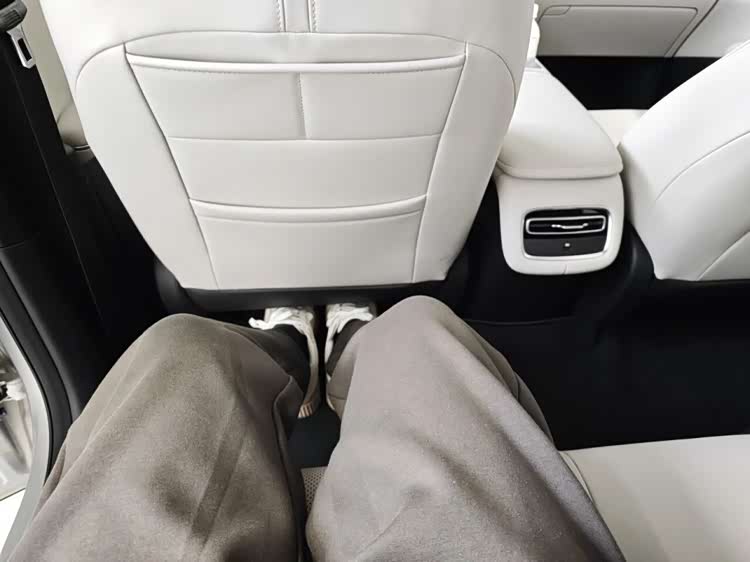 而如果不把脚往前伸,就得架着腿坐了,蹲板凳的感觉就来了,不太舒服。右后座椅则没有这个问题,副驾默认高度不低且高低不可调,脚可以非常自然地放进副驾座椅下方,很明显可以看到鞋子位置的区别。
