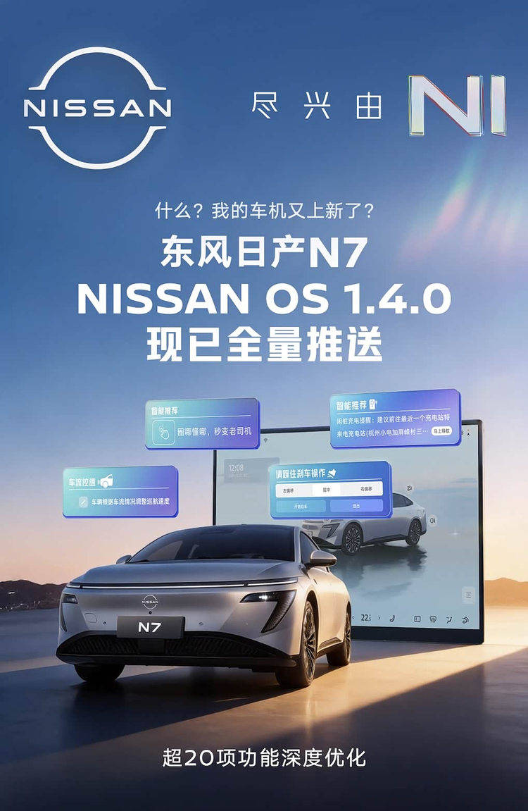 东风 日产N7(参数|询价)车型于2月13日完成了其车机系统NISSAN OS的一次重要更新,版本号迭代至1.4.0。此次升级已向所有车主推送,涉及超过20项功能的深度调整与优化,旨在提升车辆的整体使用体验。