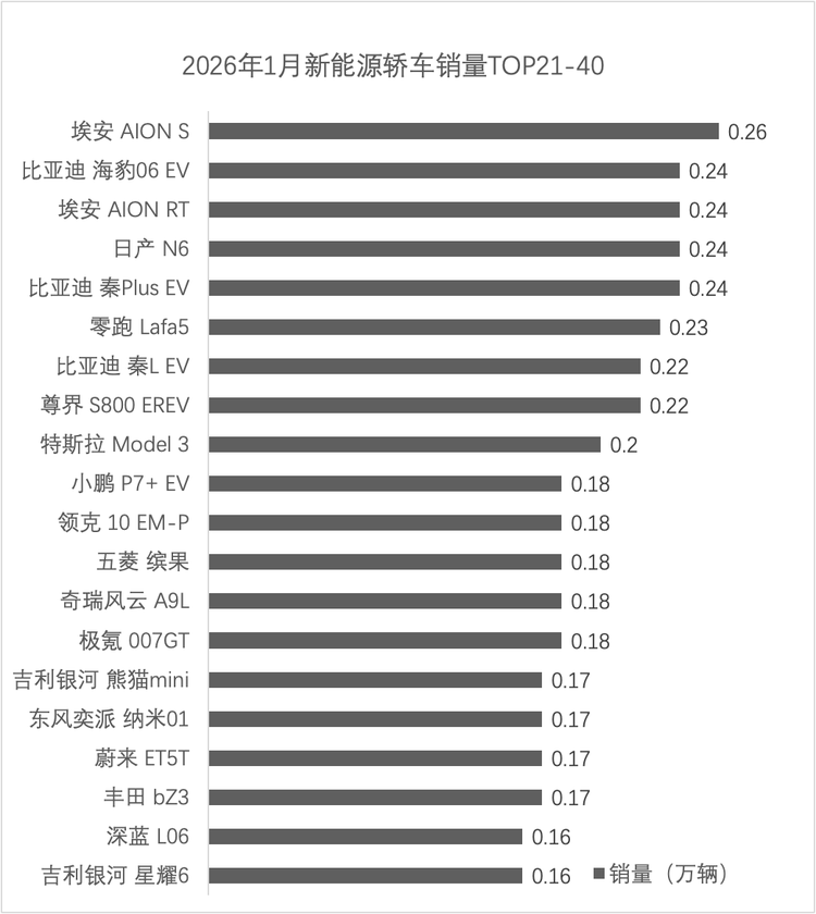 另外,插混车型在1月表现普遍一般,比如比亚迪秦L DM-i只有0.4万辆、海报06 DM-i是0.37万辆、吉利银河A7 EM-i只有0.35万辆,星耀8 PHEV只有0.26万辆、东风日产N6卖了0.24万辆、星耀6在新车期也只有0.16万辆。去年年底销量很好的奇瑞风云A9L、领克10 EM-P在1月都只卖出了0.18万辆。