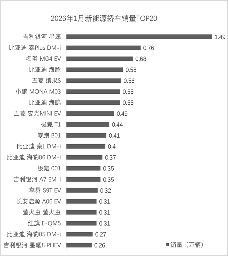 1月新能源轿车销量变化非常大,尽管吉利银河星愿继续拿下轿车销量冠军,但也明显受到了政策影响。具体来看,银河星愿售出1.49万辆,占吉利银河总销量42%。