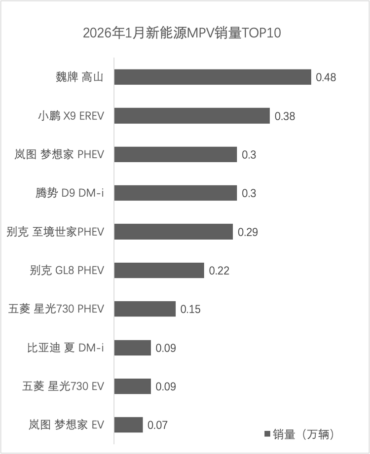 MPV方面,长城高山依然是新能源MPV的销冠,但也下滑到0.48万辆,小鹏X9超级增程则是来到了0.38万辆,位列新能源MPV第二,属于打了一个销量翻身仗。腾势D9 DM-i销量为0.3万辆;岚图梦想家插混为0.3万辆,加上700辆左右的纯电排名第三。
