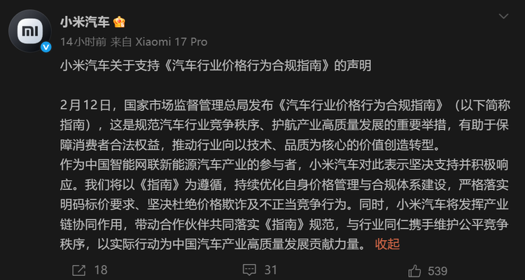 《汽车行业价格行为合规指南》发布,小米等多家车企积极响应