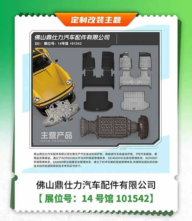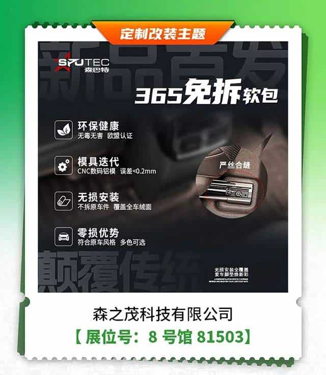 同时该主题展区还有5400余家知名改装品牌,聚焦汽车个性化升级热门趋势,品类覆盖:汽车内外改装升级、轮胎轮毂、性能部件、赛事文化、越野改装、汽车电子、汽车影音、汽车全膜、内饰精品、电商连锁等品类,全方位展示年度汽车改装新生态。