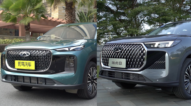 只是,光做到这种程度还不够,要知道,这是个光车身配色都得在上市发布会讲几页PPT的时代,消费者的个性化需求还是要满足一下的,为此,第五代瑞虎8推出了虎踞和豹跃两种前脸造型,两者最大的差异就是中网填充的格栅不同,虎款用了齿锋点阵格栅,豹款用了齿刃点阵格栅,就我个人而言,虎款更显霸气,豹款更偏精致,如何做选择就看你更中意哪款前脸了,它们其它的外观设计基本没差异。
