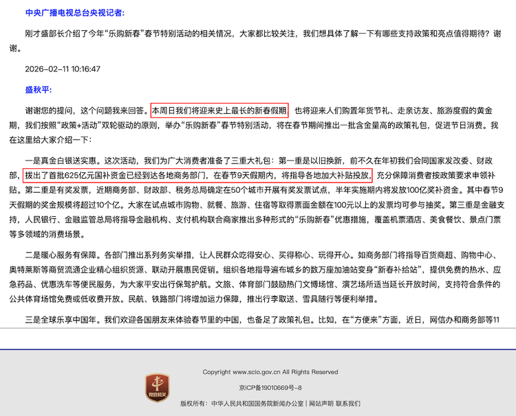 随着2026年消费品以旧换新“国补”资金的到位,盛秋平指出,春节9天假期内各地将加大补贴投放,充分保障消费者按政策要求申领补贴。