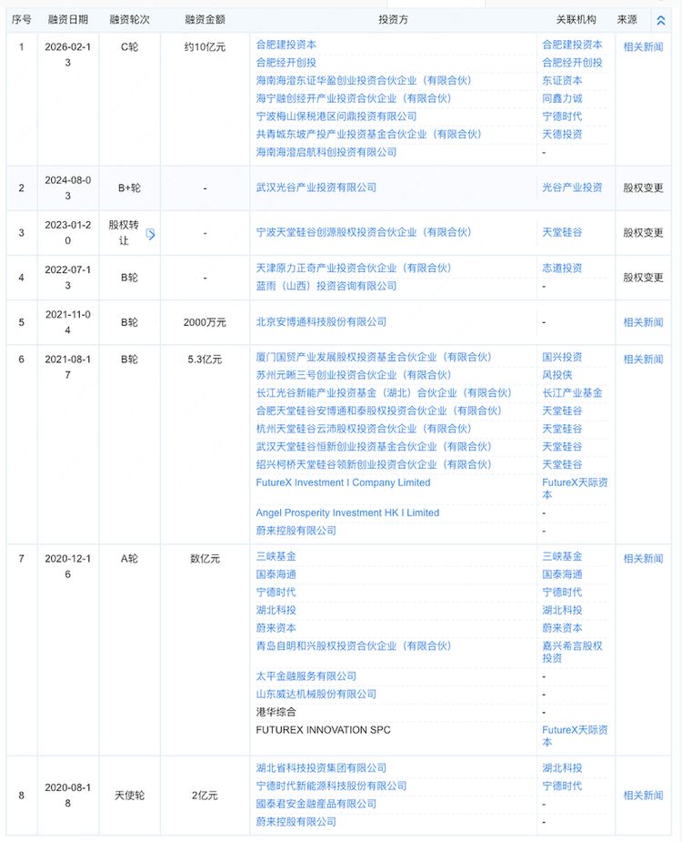 企查查信息显示,截至今日,蔚能自成立以来已经完成8轮融资。