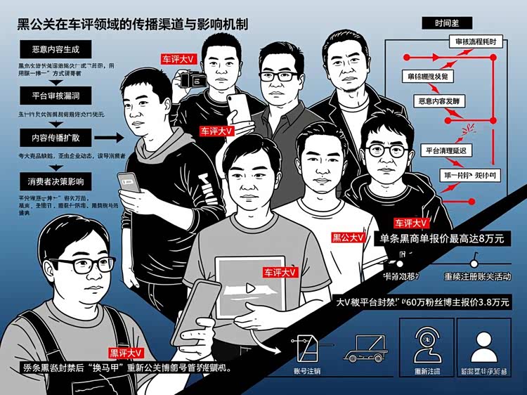 这些大V会刻意伪装成“客观中立车评人”,在视频里夸大竞品缺陷、歪曲解读企业动态,用“踩一捧一”的套路,误导不明真相的消费者;更恶劣的是,部分大V被平台封禁后,会立刻换“马甲”重新注册账号,继续从事黑公关活动,规避平台监管。除了大V,平台审核的“时间差”,也给了黑公关可乘之机——海量内容审核需要流程,恶意内容往往能发酵几个小时,甚至一两天后,才会被清理,而这段时间,足以影响很多人的购车决策,给车企造成无法挽回的损失。