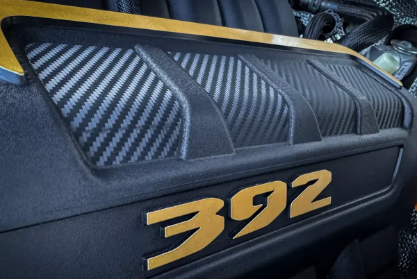 新车专属车漆叫沙漠黄,不是那种亮闪闪的漆面,是偏哑光的质感,配合引擎盖上黑色的“Willys”专属拉花,一眼就能认出这是特别版 。经典的七孔格栅没动,钢制前保险杠也是原厂标配。机舱盖带冷空气进气口+水分分离器,这是392系列的特征,不开机盖也知道底下藏了台大V8 。