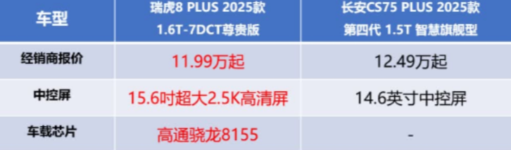 春节购车热潮如期而至,对于大多数家庭来说,一辆合适的SUV既能满足返乡通勤的便捷,也能承载全家出游的欢乐,而10万左右汽车市场成为了刚需家庭的主战场。在这一热门价位的SUV阵营中,全新瑞虎8 PLUS与长安CS75 PLUS 2025款第四代无疑是最具竞争力的两款车型。那么,这两款热门车型究竟谁更能俘获人心、成为春节购车季的“人气王”?今天我们就以两款主力车型为例,从智能、舒适、安全三大核心维度,一文读懂它们的差异与优势。