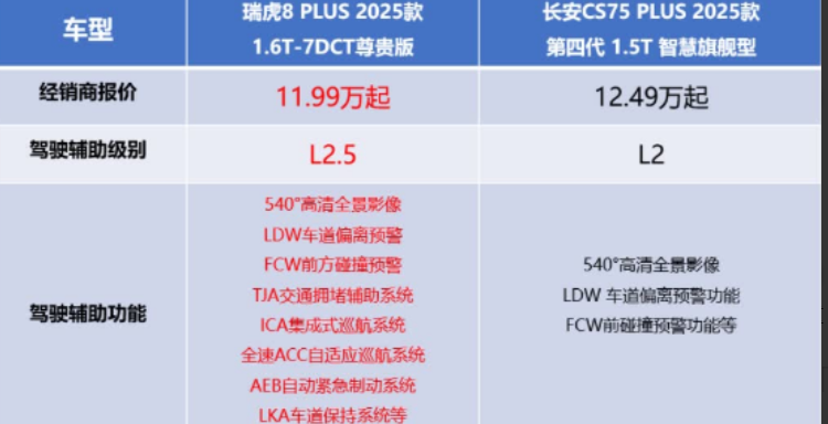 长安CS75 PLUS 2025款第四代仅搭载L2级驾驶辅助系统,虽能提供基础的车道偏离预警、前碰撞预警等功能,满足日常驾驶的基本安全需求,但在功能丰富度上与全新瑞虎8 PLUS差距明显,缺乏全速ACC自适应巡航等高频实用功能,难以应对春节复杂的出行路况。