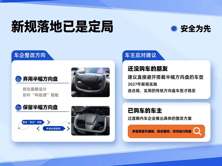 新规落地已是定局,不管是车企还是咱们车主,无需慌神,找对正确应对方式才是关键,尤其是已经入手半幅方向盘车型的车主,这些重点,一定要记牢!