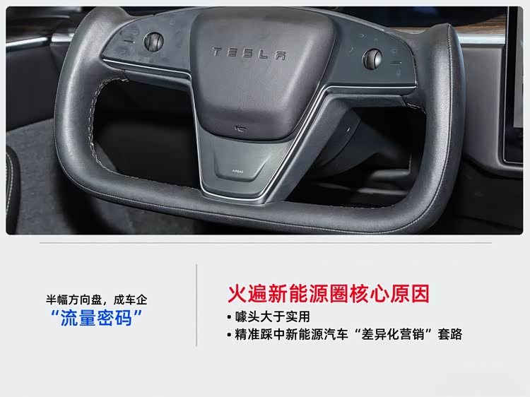 既然隐患这么多,半幅方向盘为啥能在近几年火遍新能源圈,成为特斯拉、智己、极越等品牌的“吸睛卖点”?核心原因其实很直白——噱头大于实用,精准踩中了新能源汽车的“差异化营销”套路。