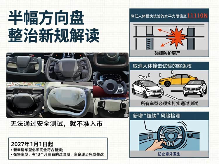 这里特别提醒大家:新规实施分两步走,不用慌!2027年1月1日起,新申请准入资质的乘用车,必须完全符合新规,严禁搭载半幅方向盘;已经在售的车型,会给13个月左右的过渡期,车企会逐步完成整改,咱们已购车车主,暂时不用过度焦虑。