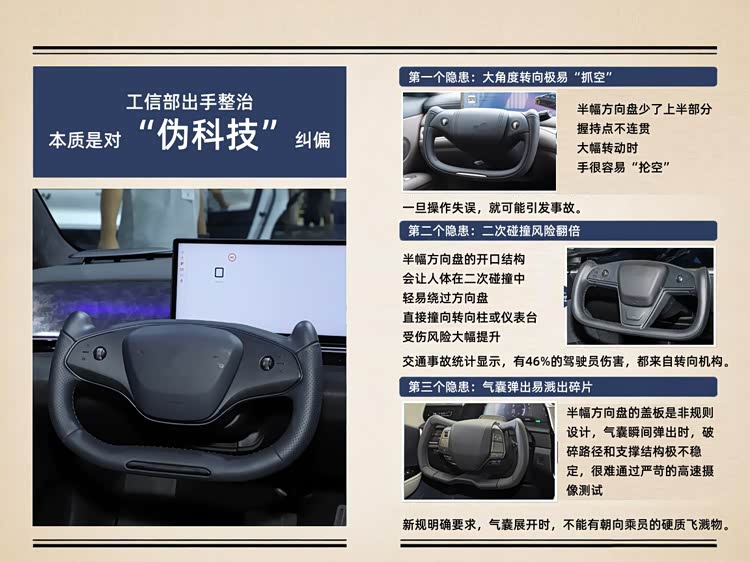 工信部出手整治,本质上就是对“伪科技”的纠偏。半幅方向盘看着炫酷,实则藏着三大致命安全隐患,也是咱们车主吐槽最多的点,结合真实车主反馈和官方测试数据,咱们一次性说透,看完你就知道为啥要整治了。