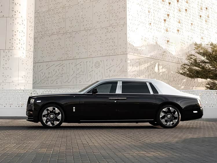 再来看车身侧面部分,车身采用上银下黑的双色涂装,主体为Diamond Black,腰线及车顶以Silver点缀,营造出层次分明的视觉效果。侧面线条简洁而硬朗,5992mm的车身长度与2018mm的宽度,赋予其修长而稳健的姿态。车门设计尤为精妙,隐藏式电动折叠板与后排影院系统巧妙收纳,确保外观整洁性。车身侧面的激光雕刻图案延伸自车头,Mashrabiya纹样以微浮雕形式呈现,手感柔滑却无激光刻痕的生硬感。这种工艺不仅提升了质感,更在行驶中随光线流转展现“显隐”变化,使车身成为动态艺术画布。整体而言,车身造型在沉稳大气中融入文化符号,诠释了“低调的奢华”。