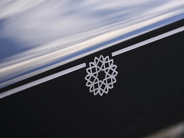 进入车内,前后排座椅填充物柔软厚实,支撑性与包裹性极佳,可满足长时间乘坐的舒适性需求,座椅头枕上绣有同色系的Mashrabiya纹样,刺绣细腻精致,需凑近方可辨识,实现了内外设计的呼应。发光迎宾踏板上刻有机舱盖雕刻纹样的横截面细节,开门瞬间灯光亮起,仪式感拉满。