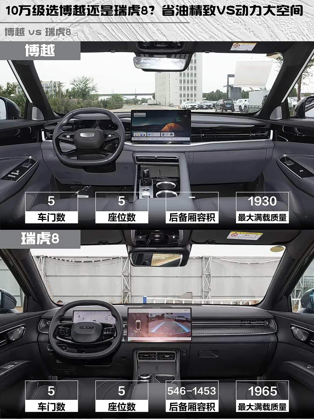 最后说价格:博越9.19万比瑞虎8便宜1.8万,但瑞虎8多了电动尾门、全景天窗等配置。要我说,追求性价比和精致感选博越,想要大空间和强动力就冲瑞虎8,你们会pick谁呢?