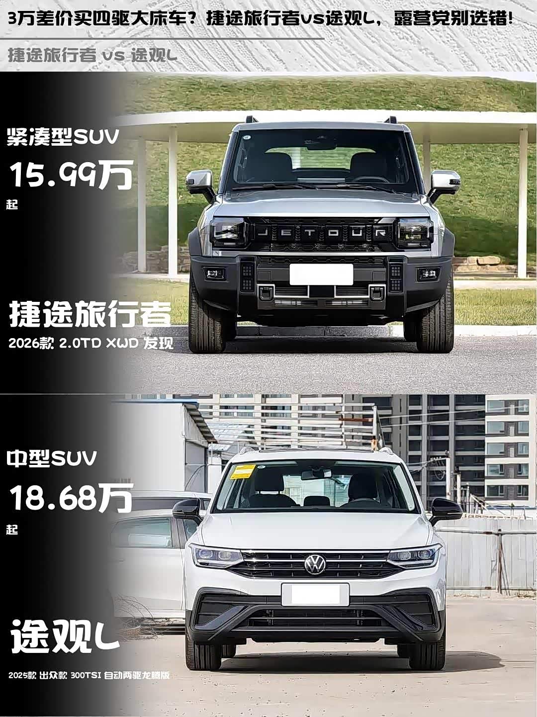 车家号·0浏览·2026-02-14 08:43 · 北京最近在选车的小伙伴看过来!今天给大家深度对比两款热门SUV—— 捷途旅行者(参数|询价)2026款2.0TD XWD发现版和途观L 2025款出众款300TSI自动两驱龙腾版,看看谁更值得入手!🔥