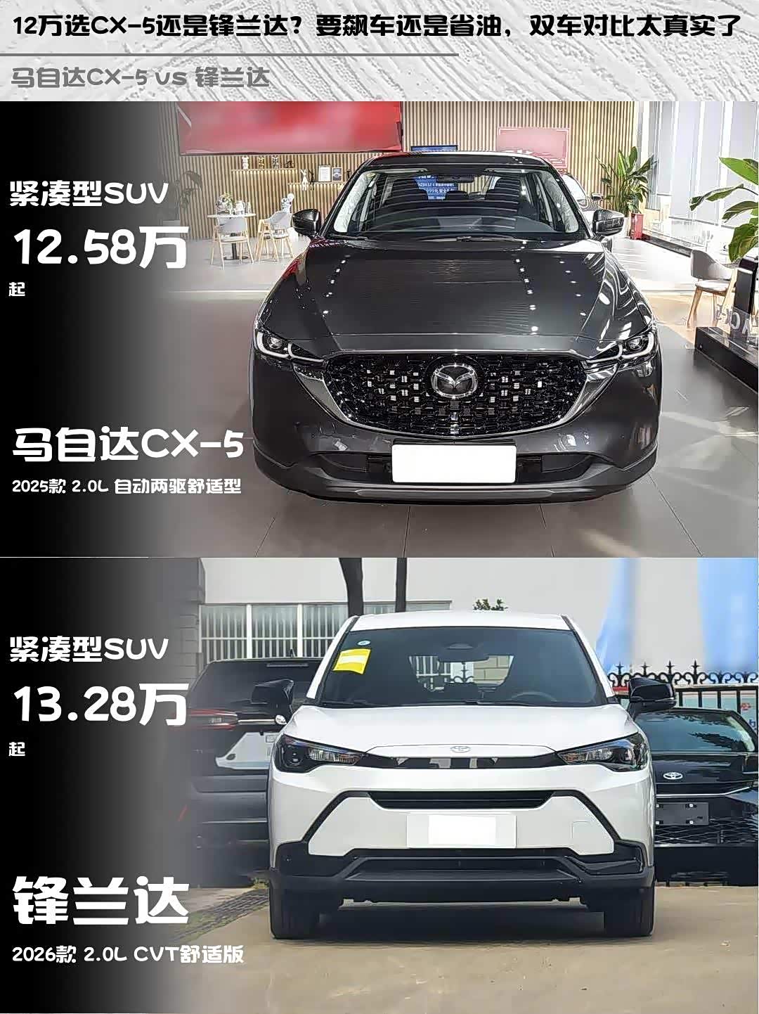 车家号·0浏览·2026-02-14 08:51 · 北京最近后台好多兄弟在问12万级合资SUV怎么选,刚好深度试驾了 马自达CX-5(参数|询价) 2025款 2.0L 自动两驱舒适型和锋兰达 2026款 2.0L CVT舒适版,这两台车差价不到1万但性格截然不同🔥