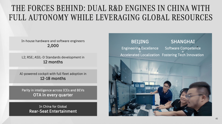 奔驰在中国北京和上海拥有两个研发中心,分别聚焦“工程卓越与本地化提速”和“软件能力与技术创新培育”,但奔驰进一步强调这两个研发中心将在充分利用全球资源的同时,保持完全自主。并且明确提出了研发速度的要求,L2辅助驾驶要在12个月内完成、人工智能座舱研发周期12-18个月、现有产品的OTA升级要达到每季度一次。