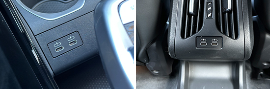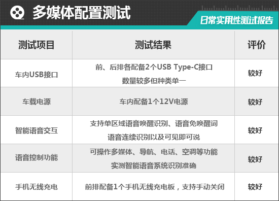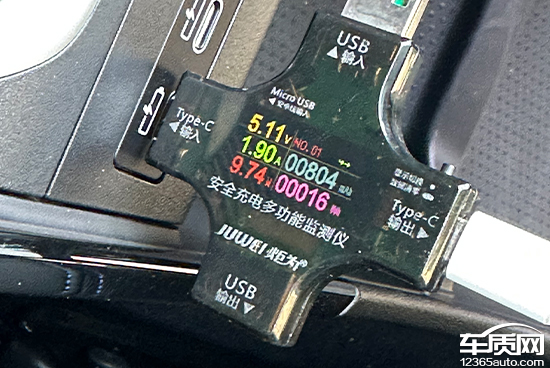 在车内USB接口方面,评测车前、后排各配有2个USB Type-C接口,数量可观但种类单一。我们对USB接口进行了测试,全车USB Type-C接口的测试成绩均在5.11V、1.9A、9.74W左右。此外,评测车还配备1个12V电源。