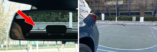 后方视野测试中,依旧将桩桶固定摆放,随后移动车辆直至可以观察到桩桶上沿为止。实测后方视野所测得的距离为8.586m,与测试过的同级别车型相比同样处于上游水平。
