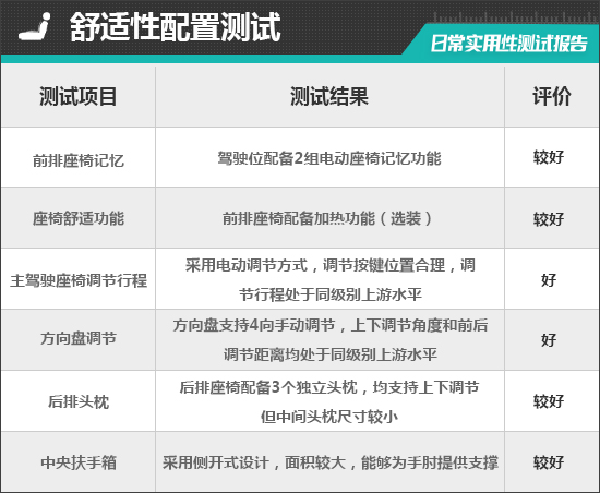 在主驾驶座椅测试中,评测车的主驾驶座椅最前端和最末端之间的距离为270mm,在测试过的同级别车型中处于上游水平,能够满足大部分驾驶者的使用需求。