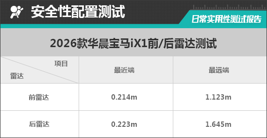 前驻车雷达最远可在1.123m处感应到前方物体,雷达功率表现出色,最近端提示距离为0.214m,表现同样未达到同级别车型平均水平。