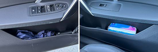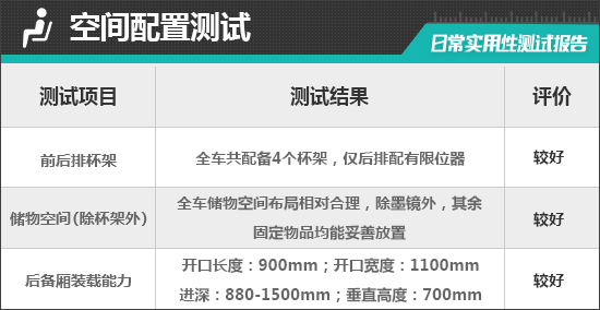 对于车内使用空间的测试,只针对前排触手可及的空间,不包括手套箱、中央扶手箱等需开启的空间。测试方法是将以下固定物品全部放置在前排的各个储物空间内,通过固定物品的放置情况来判断车辆储物空间的表现。测试选定的固定物品为:2瓶常规大小的矿泉水、1部大屏手机、1支口红、1个挎包、1副墨镜、1把折叠雨伞以及1包常规尺寸的抽纸。