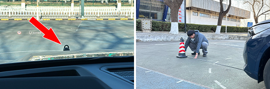 在前方视野测试中,我们采用高70cm的桩桶作为参照物,随后调整车距,直至在主驾驶位可以看到桩桶上沿。经过测试,桩桶与车头最终测得的数据为2.423m,在测试过的同级别车型中处于上游水平。