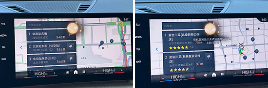 经过实测,系统可以正确执行“打开副驾车窗”指令,且反应速度较快,但无法理解和执行指着副驾车窗说“打开这个”指令。对于“我有点饿了”指令,系统会快速查找附近餐厅,并询问是否需要导航前往,但无法理解“我有点不太舒服”指令,且没有任何回复。对于“导航到北京站东街”这样容易混淆的复杂指令,系统能够排除干扰正确理解;此外,对于“导航到附近大众点评得分4.5分以上的川菜馆”指令,系统也能给出正确的回复。智能交互方面,系统无法理解指令7和指令8,且没有任何回复。此外,评测车还支持单区域语音唤醒识别、语音免唤醒词、语音连续识别以及可见即可说,便利性表现较好。