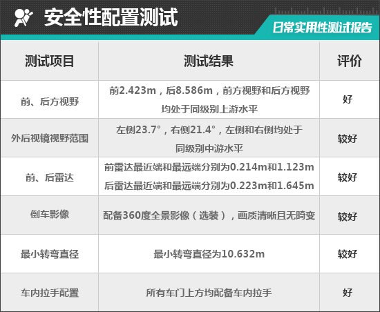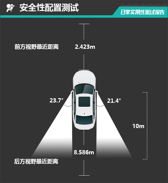 在车辆前、后方视野测试中,车内所有座椅均已调整至最低状态,所测出的数据与驾驶者正常使用时均有一些偏差,仅供参考。