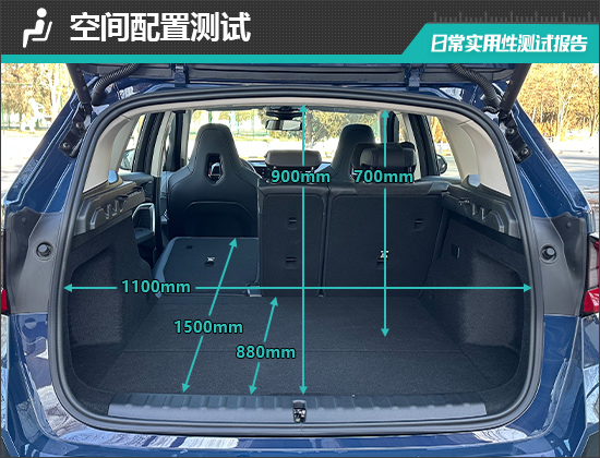 后备厢内部造型较为规整,后排座椅支持比例放倒,放倒后可以进一步拓展后备厢空间。对于评测车后备厢的基础数值,我们也进行了实测,开口长度为900mm;开口宽度为1100mm;后备厢进深为880-1500mm;后备厢地台与顶部的垂直高度为700mm。