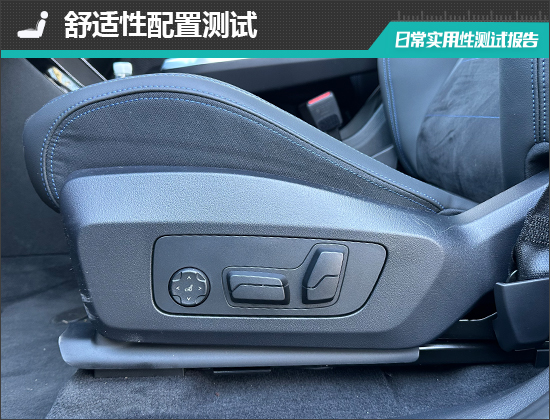 舒适性配置方面,评测车的前排座椅调节按键分别位于座椅左右两侧,位置合理且操作便捷。同时,前排座椅选装了加热功能,驾驶位还配备2组电动座椅记忆功能,整体舒适性表现可圈可点。