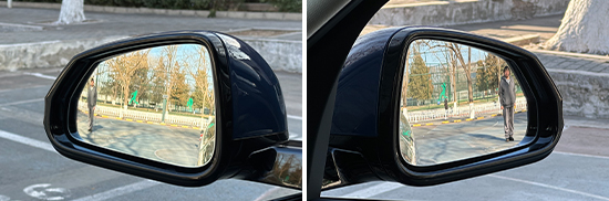评测车左外后视镜采用双曲率镜片,右外后视镜采用普通镜片,经实测,左、右外后视镜视野范围分别为23.7°和21.4°,均处于同级别中游水平。