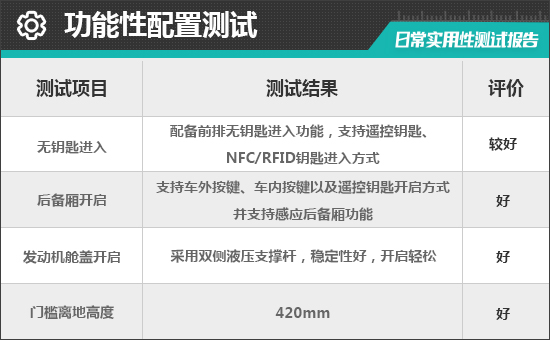 在功能性配置方面,评测车配备了前排无钥匙进入功能,并支持遥控钥匙、NFC/RFID钥匙进入方式,用户只需携带钥匙靠近车辆便可自动解锁,反之则自动上锁。上述操作在实测过程中并未出现失灵的情况。