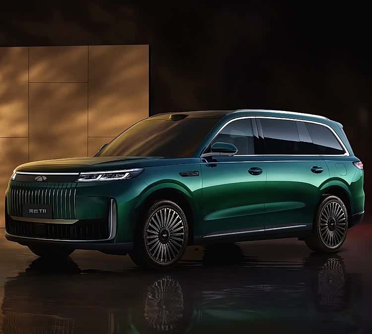 风云T11定位于大型SUV,车身尺寸达到5205×1998×1800毫米,轴距为3120毫米。侧面比例协调,超 5.2 米车长带来修长的车身线条,1800毫米的车高则确保了车内空间的充裕。20英寸的轮圈搭配255/50 R20规格的静音轮胎,既保证了行驶舒适性,也提升了整车的气场。