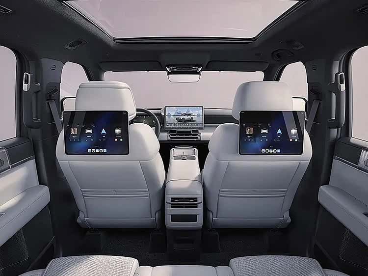 座舱采用双层环绕悬浮式仪表台设计,纯平的造型配合可开启的全景天窗,创造了开阔的车内视野。材质上大量使用软质包裹,配合金属饰条和精细的缝线工艺,营造出既有科技感又不失温馨的氛围。