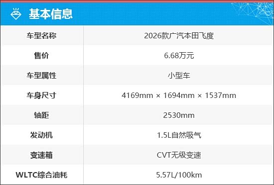 2026款广汽本田飞度仅推出1款车型,售价6.68万元,搭载1.5L自然吸气发动机和CVT变速箱的动力组合。