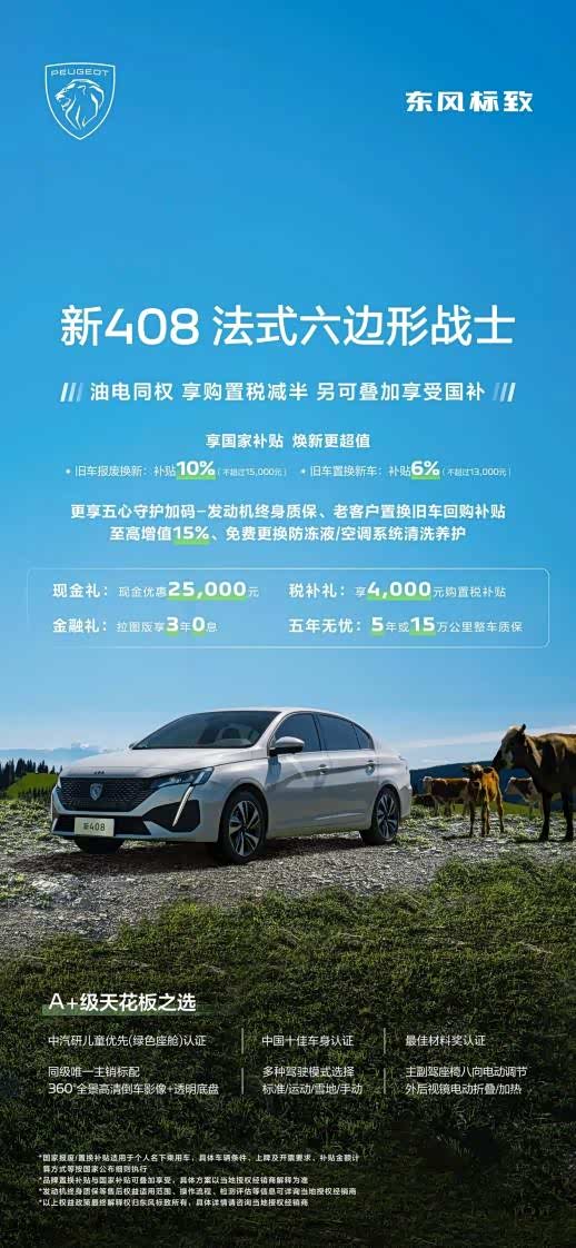 除东风标致直补外,两款车型更可同步享受多重购车权益叠加。东风标致新408推出限时购车政策:现金礼25000元、税补礼4000元购置税补贴,新408龘龘款拉图版更享3年0息金融礼遇,同步提供5年或15万公里整车质保。东风标致508L同步释放“油电同权 享购置税减半”政策,涵盖现金优惠11000元、税补礼6000元购置税补贴,焕新礼10000元换购补贴、5000元增购补贴(置换不限品牌,增购限本品牌),金融礼3年0息,质保礼5年或15万公里整车质保。多重礼遇层层叠加,正是岁末年初入手法系好车的最佳时机。