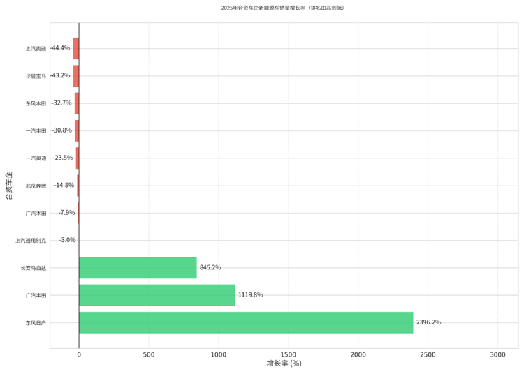 东风日产、广汽丰田和长安马自达,是 2025 年里「合资 2.0」品牌中的「大赢家」:东风日产新能源车销量年增长率达到惊人的 2396.2%、广汽丰田达到 1119.8%、长安马自达也有 845.2%。